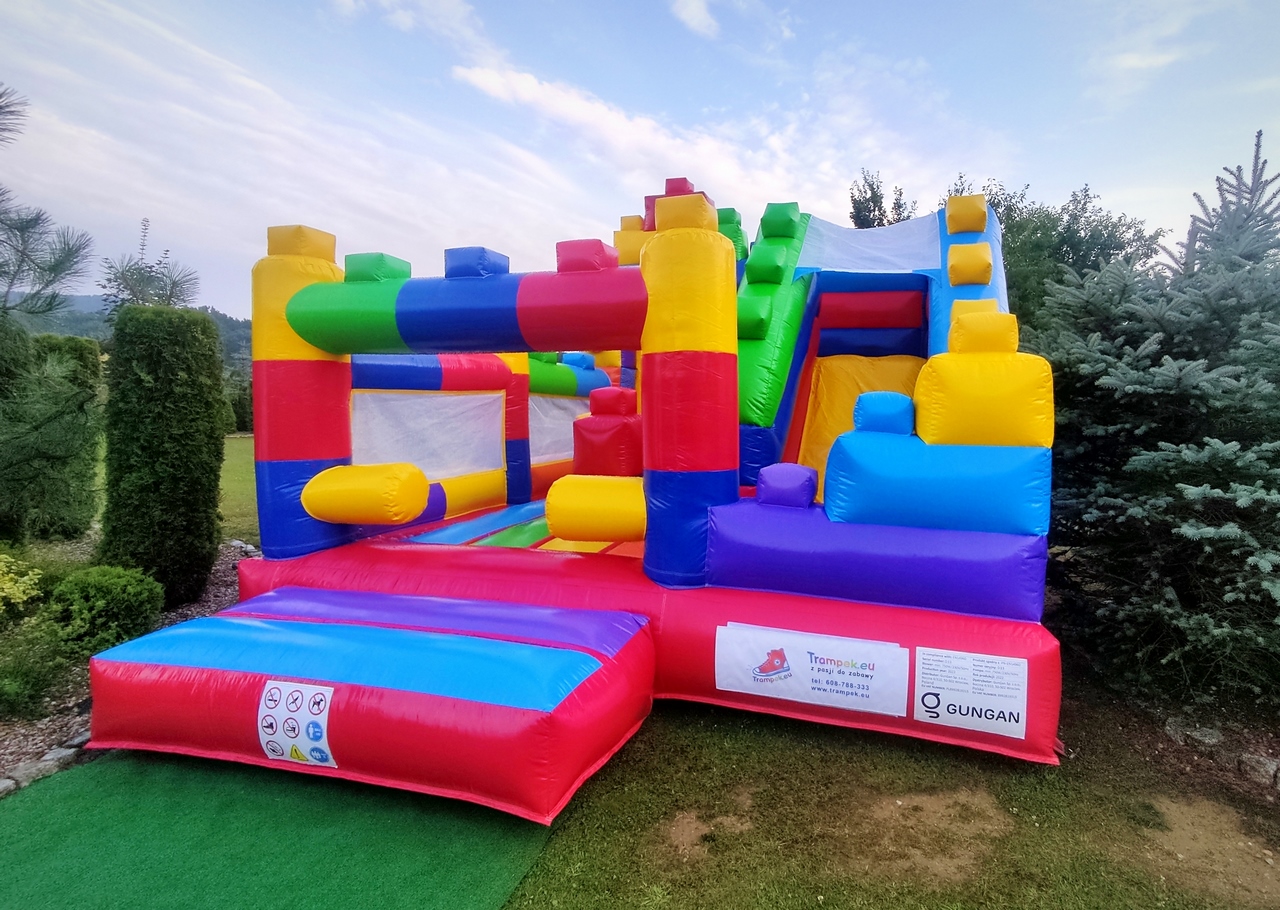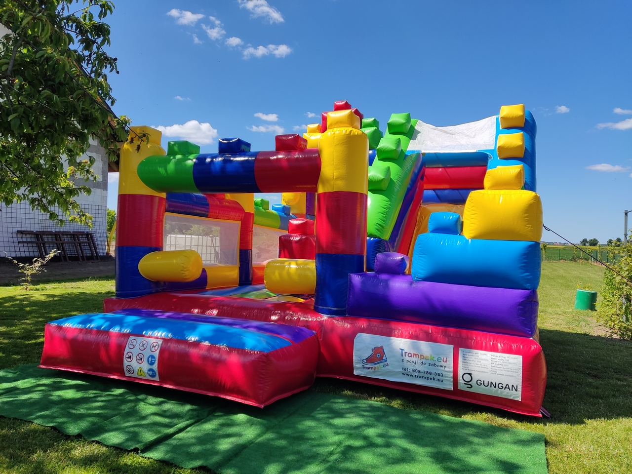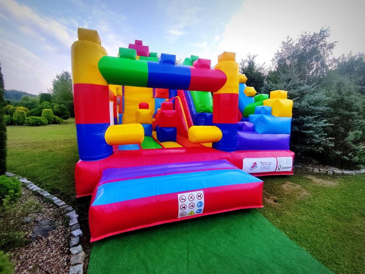 Średni dmuchany plac zabaw ze zjeżdżalnią, torem przeszkód, wspinaczką oraz miejscem do biegania – w motywie z kolorowymi klockami LEGO.