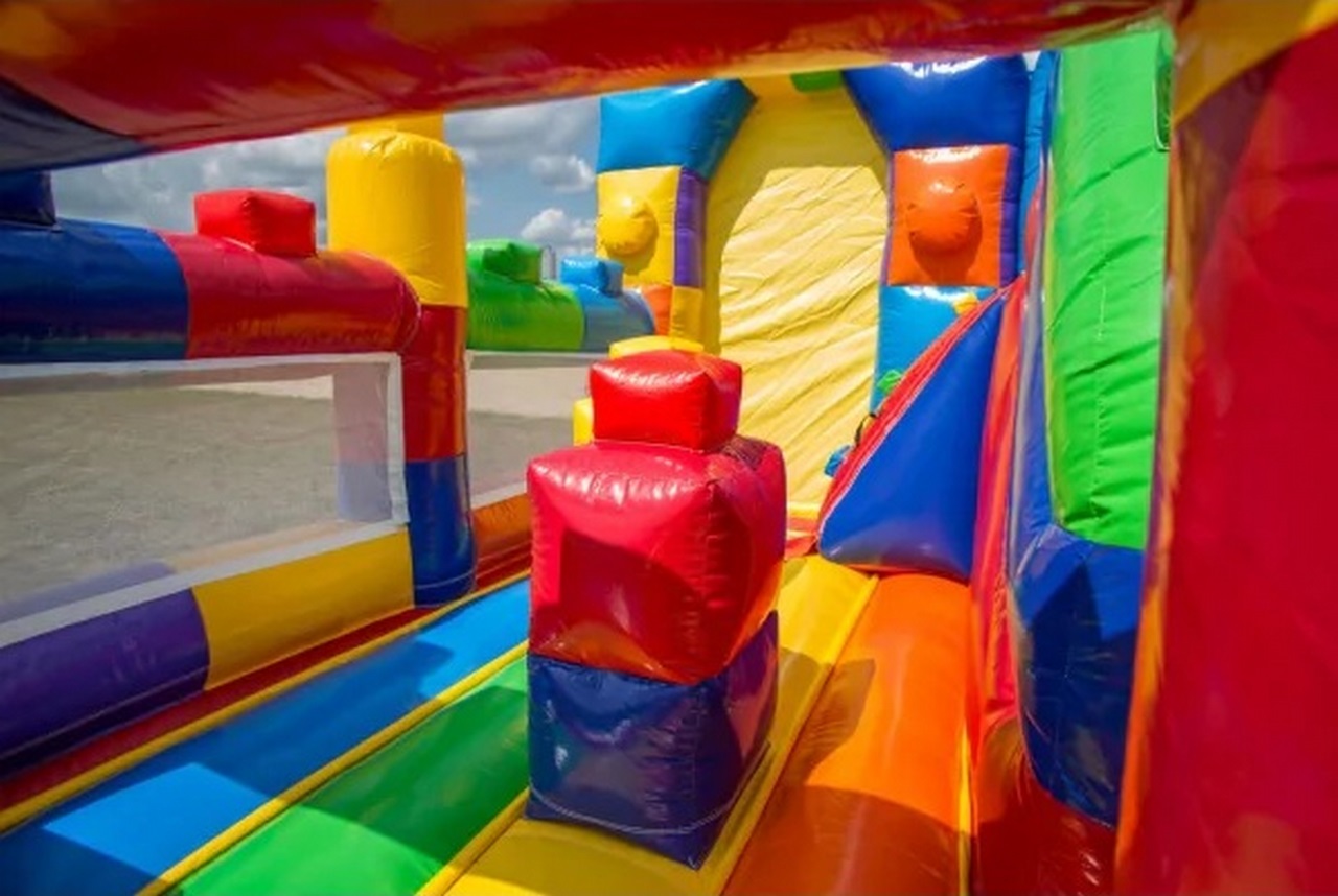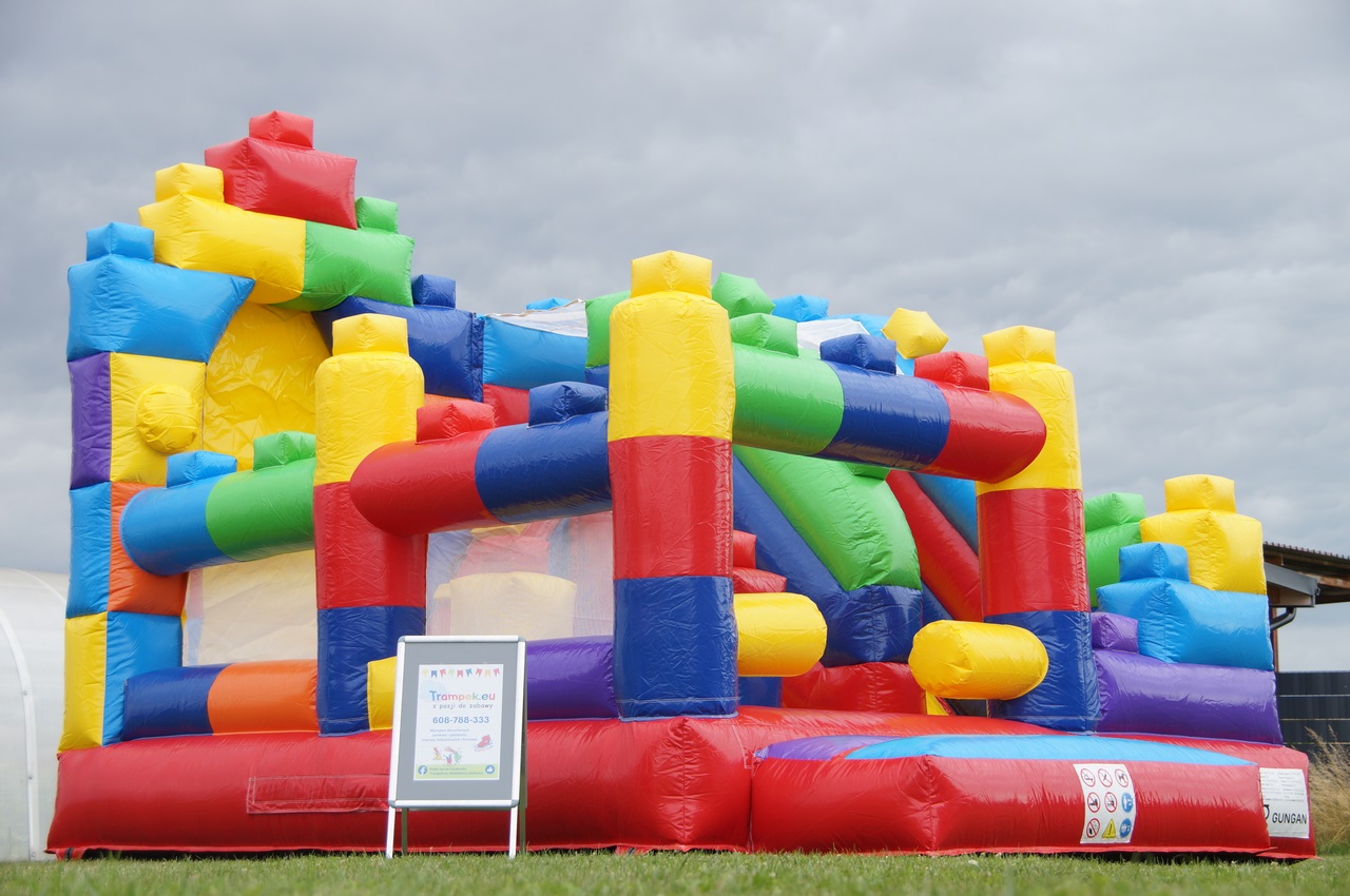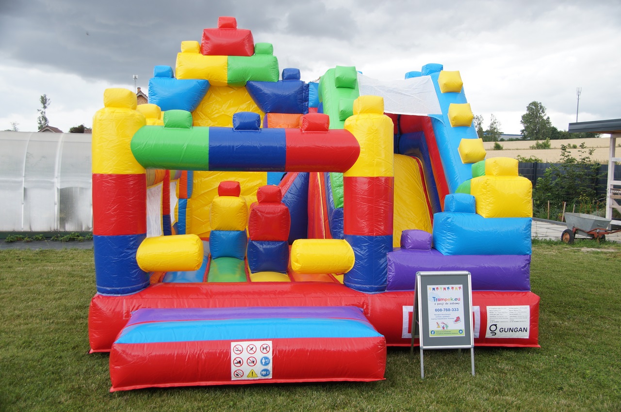 Średni dmuchany plac zabaw ze zjeżdżalnią, torem przeszkód, wspinaczką oraz miejscem do biegania – w motywie z kolorowymi klockami LEGO.
